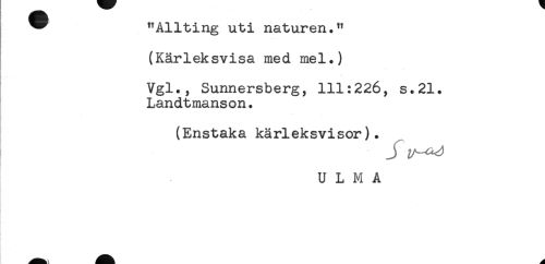 //// ^ "Allting uti naturen." //// (Kärleksvisa med mel.) //// Vgl., Sunnersberg, 111:226, s.21. //// Landtmanson. //// (Enstaka kärleksvisor). //// ) J //// U L M A ////
