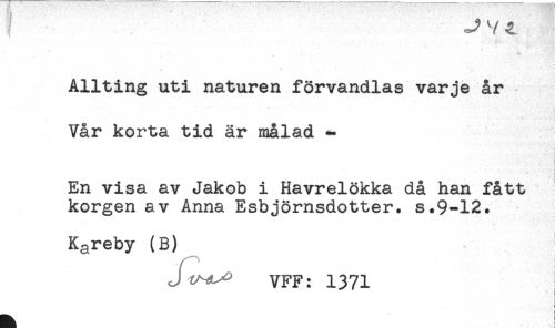 //// ' —. //// Allting uti naturen förvandlas varje år //// Vår korta tid är målad ** //// < //// En visa av Jakob i Havrelökka då han fått //// korgen av Anna Esbjörnsdotter, s.9-12. //// Kareby (B) ! //// VFF: 1371 ! //// I //// t //// t //// t ////