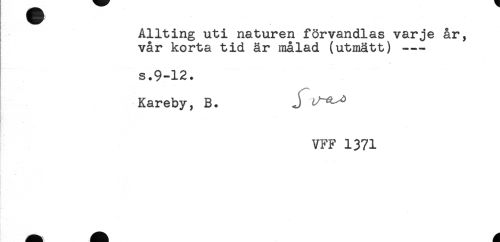 //// Allting uti naturen förvandlas varje år, //// } vår korta tid är målad (utmätt) -— //// s.9-12. //// Kareby, B. J //// VFF 1371 ////