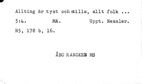 //// Allting är tyst och stilla, allt folk ... //// 5:4. MA. Uppt. Nessler. //// R5, 178 b, 16. //// ÅBO RANCKEB MS //// - //// ....., //// t. ////