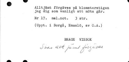 //// Alltjämt förgäves på blomsterstigen //// jag dig som vanligt att möta går. //// Nr 17. mel.not. 3 str. //// (Uppt. i Borgå, Emsalö, av O.A.) //// BRAGE VISBOK ////