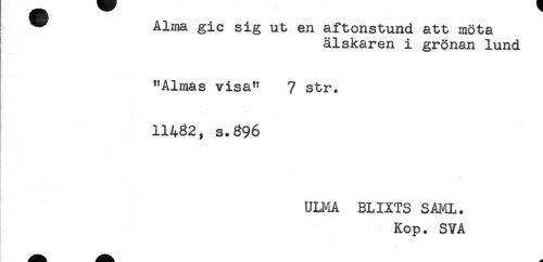 //// — A±ma gic sig ut en aitonstund att möta //// älskaren i grönan lund //// "Almas visa" 7 str. //// 11432, s.396 //// - . ^ //// . //// . //// ULMA BLIXTS SAML. //// Kop. SVA ////