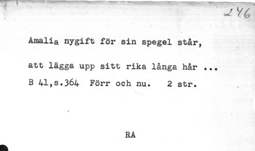 //// ^ f //// ? ! ** //// - - L //// 'J ' . //// <* 4 . ' //// Amalia nygift för sin spegel står, //// att lägga upp sitt rika långa hår ... //// B 41,s.364 Förr och nu. 2 str. //// RA ////