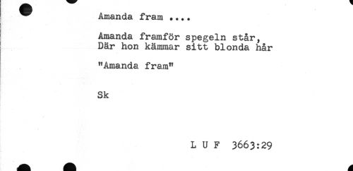 //// Amemuct i ram # . . . //// Amanda framför spegeln står, //// Där hon kämmar sitt blonda hår //// "Amanda fram" //// Sk //// L U F 3663:29 ////
