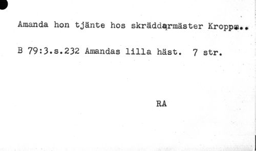 //// ( //// Amanda hon tjänte hos skräddqrmäster Kroppw.. //// B 79:3.s.232 Amandas lilla häst. 7 str. //// ** //// t //// t //// ' ! //// * ' //// t //// RA //// * t . * . //// : ////