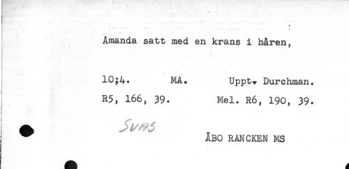 //// * //// .-.t.".. //// * - * . //// Amanda satt med en krans i håren. //// i - * //// i //// * * . ^ //// . //// ! . * ' * . * //// 10;4. MA. Uppt, Durchman. //// R5, 166, 39. Mel. R6, 190, 39. //// ÅBO RANCKEN MS ////