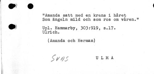//// "Amanda satt med en krans i håret //// Som ängeln mild och som ros om våren." //// t ^ Upl. Hammarby, 303:919, s.17* //// Ulrich. //// * //// . //// i (Amanda och Herman) //// T ////