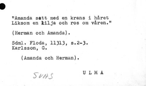 //// "Amanda satt med en krans i håret //// Liksom en kil ja och ros om våren." //// (Herman och Amanda). //// Sdml. Flöda, 11313, s.2-3* //// Karlsson, G. //// (Amanda och Herman). //// < ////
