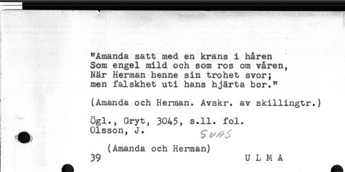 //// //// Amanda satt med en krans i håren //// Som engel mild och som ros om våren, //// När Herman henne sin trohet svor; //// men falskhet uti hans hjärta bor." //// (Amanda och Herman. Avskr. av skillingtr.) //// i , //// i * //// i Ögl., Gryt, 3045, s.ll. fol. //// ^ Olsson, J. ^^ //// (Amanda och Herman) //// 39 U L M A ////