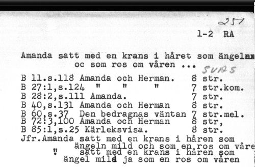 //// . ' ' . ' - ' . - . .. - //// 1-2 RA //// . //// Amanda satt med en krans i håret som ängelBN //// oc som ros om våren ... ^ //// B 11.s.116 Amanda och Herman. 6 str. //// B 27:1,s.124 " " t* 7 str.kom. //// B 26:2,s.111 Amanda. 7 str. //// B 40,s.131 Amanda och Herman å str. //// B 60,s.37 Den bedragnas väntan 7 str.mel. //// B 72:3*-i-00 Amanda ocn Herman o str, //// B 65:l,s.25 Kärleksvisa. 6 str. //// Jfr.Amanda satt med en krans i håren som //// .. ängeln mild och som, en.ros om våre //// V satt med en krans i haren gom ; //// ängel mild ja som en ros om våren ! ////