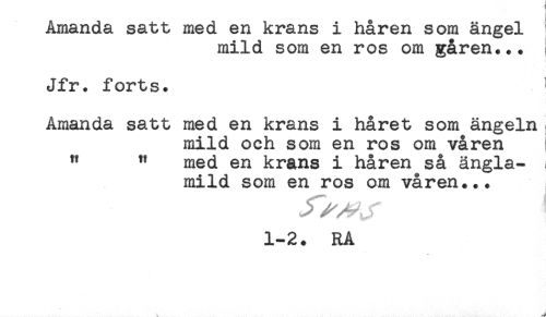 //// mild som en ros om gåren... ! //// Jfr. forts. ^ //// Amanda satt med en krans i håret som ängeln ^ //// mild och som en ros om våren ! //// " " med en krans i håren så ängla- < //// mild som en ros om våren... //// 1-2. RA ////