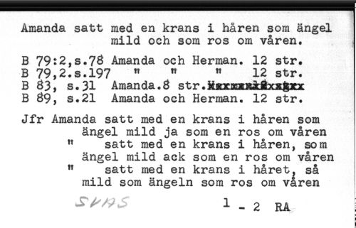 //// Amanda satt med en krans i håren som ängel //// mild och som ros om våren. //// % //// B 79:2,s.76 Amanda och Herman. 12 str. //// B 79,2.s.l97 " " " 12 str. //// B 83, s.31 Amanda.6 str.HaacsaxB&Éxx3xx //// B 69, s.21 Amanda och Herman. 12 str. //// * //// Jfr Amanda satt med en krans i håren som //// ängel mild ja som en ros om våren //// " satt med en krans i håren, som //// ängel mild ack som en ros om våren //// " satt med en krans i håret, så //// mild som ängeln som ros om våren //// -r^' 1 - 2 RA //// ) //// i //// t- ////