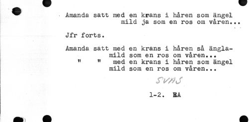 //// ^^ - Amanda satt med en kcans i håren som ängel //// mild ja som en ros om våren... //// Jfr forts. //// //// /Amanda satt med en krans i håren så ängla- //// mild som en ros om våren... //// " " med en krans i håren som ängel //// mild som en ros om våren... //// 1-2. RA ////