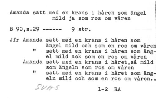 //// Amanda satt med en krans i håren som ängel //// mild ja som ros om våren i //// B 90,s.29---— 9 str. //// Jfr Amanda satt med en krans i håren som i //// ängel mild och som en ros om våreij //// " satt med en krans i håren som äng-^ //// el mild ack som en ros om våren //// Amanda satt med en krans i håret,så mild //// som ängeln som ros om våren //// " satt med en krans i håret som äng- //// eln mild och som en ros om våren.. //// 3 1-2 RA ////