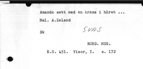 //// * -1 * ' * - *" * * * . //// * ' ' '. v * * .' //// Amanda satt med en krans i håret ... //// ... . . //// Mel. A.Zeland //// Sk ^^^ //// w - //// .w - '- - ' . //// NORD. MUS. //// . //// . ^ - //// E.U. 451. Visor, 1. s. 172 ////