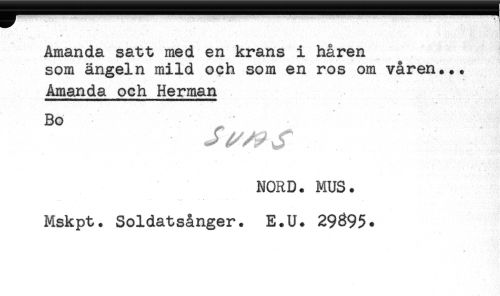 //// ^^^ .... //// - * //// Amanda satt med en krans i håren //// som ängeln mild och som en ros om våren... //// Amanda och Herman //// * ** " ''.*' //// Bo //// NORD. MUS. //// Mskpt. Soldatsånger. E.U. 29^95. ////