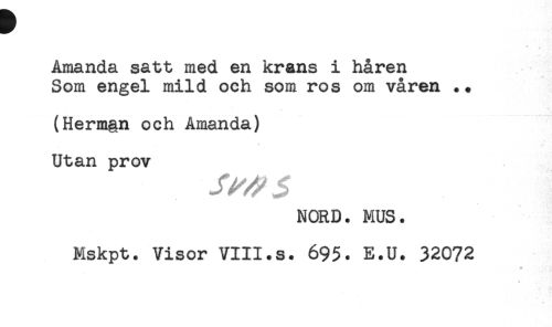 //// Amanda satt med en krans i håren //// Som engel mild och som ros om våren .+ //// (Herm§n och Amanda) //// * //// Utan prov //// NORD. MUS. //// Mskpt. Visor VIII.s. 695. E.U. 32072 ////