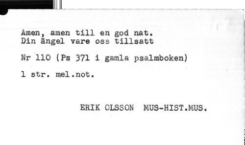 //// Amen, amen till en god nat. //// Din ängel vare oss tillsatt //// Nr 110 (Ps 371 i gamla psalmboken) //// 1 str. mel.not. //// ERIK OLSSON MUS-HIST.MUS. //// * //// a //// i ////