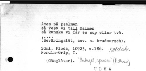 //// ... //// - - //// .. . ' ^ < * ' - * - * * ' ' -' ^ . .* . - - * //// - ^ . . . . ... . . * ' //// Amen på psalmen //// så resa vi till Malmen //// så kanske vi får en sup eller två. //// * * - //// # # # # # //// (Beväringslåt, anv. s. brudmarsch). //// Sdml. Flöda, 10923, s .186. //// Nordin-Grip, I. //// # (Gånglåtar). //// U L M A ////
