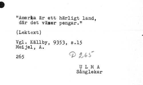 //// "Amerta är ett härligt land, //// där det växer pengar." //// (Lektext) //// Vgl. Källby, 9353, s.15 //// Meijel, A. //// 265 //// U L M A //// Sånglekar ////