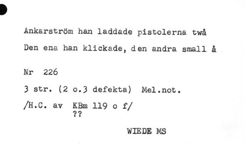 //// Ankarström han laddade pistolerna twå //// Den ena han klickade, den andra small å //// Nr 226 //// 3 str. (2 o.3 defekta) Mel.not. //// /H.C. av KBm 119 o f //// /?? //// WIEDE MS ////