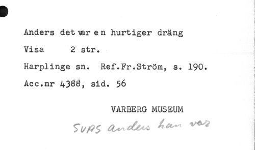 //// ! //// { //// Anders detiaren hurtiger dräng //// Visa 2 str. //// ! //// : //// Harplinge sn. Ref.Fr.Ström, s. 190. i //// i //// : //// Acc.nr 4383, sid. 56 //// I //// [ //// i //// I //// VARBERG MUSEUM ////