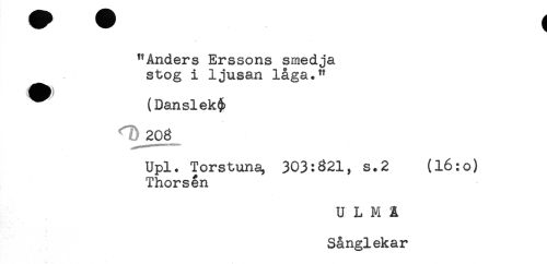 //// "Anders Erssons smedja //// stog i ljusan låga." //// ^ (Danslek^ //// 206 //// Upl. Torstuna, 303:321, s.2 (16:o) //// Thorsén //// U L M R //// Sånglekar ////