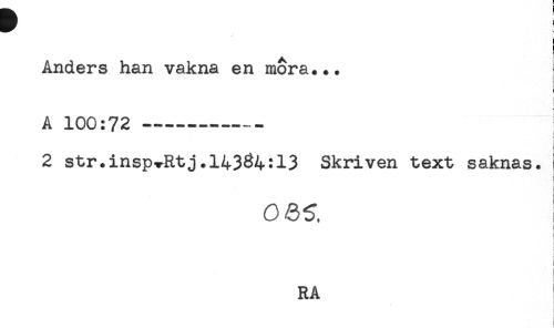 //// Anders han vakna en mora... //// j //// A 100:72 --- //// i //// < //// 2 str.insp^Rtj.14384:13 Skriven text saknas. ! //// ! //// 0 65. ! //// i //// t //// t //// i //// RA ////