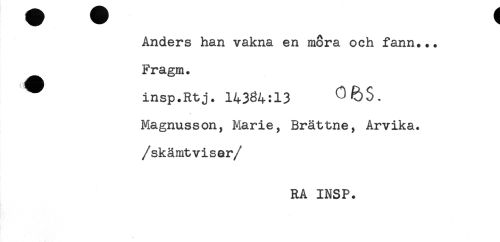 //// Anders han vakna en mora och fann... //// Fragm. //// ^ insp.Rtj. 14334:13 //// Magnusson, Marie, Brättne, Arvika, //// /skämtvisar //// /RA INSP. ////