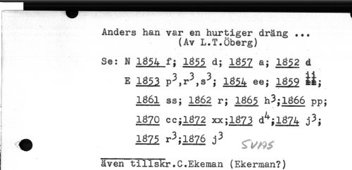 //// Anders han var en hurtiger dräng ... //// (Av L.T.Öberg) //// * - //// Se: N 1854 f; 1855 d; 1857 a; 1852 d //// - - //// E 1811 p3,r3,s3; ig^. ee; 18^9 ii; //// < * * - //// < //// 1861 ss; 1862 r; 1865 h3;l866 pp; //// ^ * * * . ^ //// 1870 cc;l872 xx;l873 d^;l874 j3; //// även tillskr.C.Ekeman (Ekerman?) ////