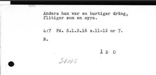 //// -— - * . ... '. - . .. . . , _ . * //// Anders han var en hurtiger dräng, //// flitiger som en myra. //// ! //// ! //// ! //// !)- //// t //// 4:7 PA. S.L.S.16 s.11-12 nr 7. //// N. //// ÅBO //// i ////