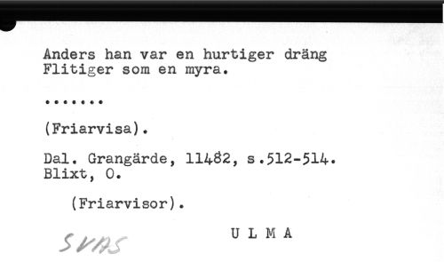 //// Anders han var en hurtiger dräng //// Flitiger som en myra. //// (Friarvisa). //// Dal. Grangärde, 11462, s.512-514. //// Blixt, 0. //// (Friarvisor). ////