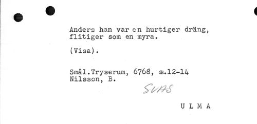 //// Anders han var en hurtiger dräng, //// flitiger som en myra. //// (Visa). //// Smål.Tryserum, 6766, 12-14 //// Nilsson, B. //// U L M A ////