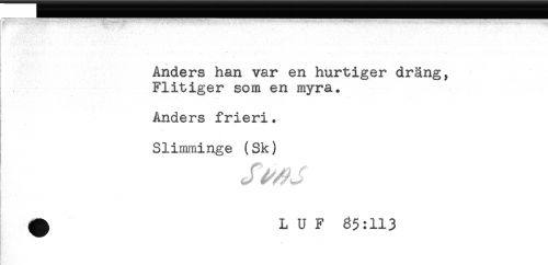 //// Anders han var en hurtiger dräng, //// Flitiger som en myra. //// Anders frieri. //// Slimminge (Sk) //// . //// ^ L U F 85:113 ////