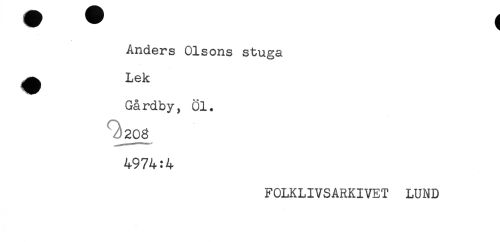 //// ^ 1 //// Anders Olsons stuga //// # Lek //// Gårdby, Öl. //// ^ 208 //// 4974:4 //// FOLKLIVSARKIVET LUND ////