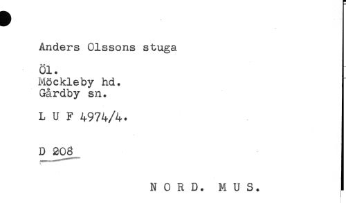 //// Anders Olssons stuga //// Öl. //// Möckleby hd. //// Gårdby sn. //// L U F 4974/4. //// D 208 //// 3, //// N 0 R D. M U S. ! ////