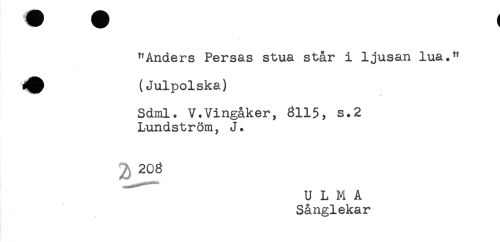 //// "Anders Persas stua står i ljusan lua." //// ^^ (Julpolska) //// Sdml. V.Vingåker, 6115, s.2 //// Lundström, J. //// 206 //// U L M A //// Sånglekar ////