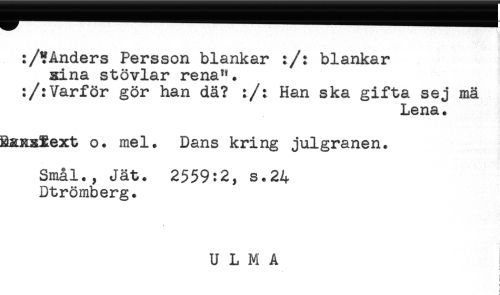 //// :/TAnders Persson blankar :/: blankar //// sina stövlar rena". //// :/:Varför gör han dä? :/: Han ska gifta sej mä //// Lena. //// Sångtext o. mel. Dans kring julgranen. //// Smål., Jät. 2559:2, s.24 //// Dtrömberg. //// U L M A I //// t //// t //// ! //// t ////