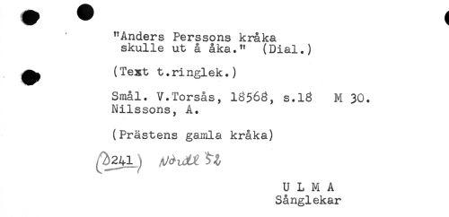 //// "Anders Perssons kråka //// skulle ut å åka." (Dial.) //// ^ (Text t.ringlek.) //// Smal. V.Torsås, I8568, s.18 M 30. //// Nilssons, A. //// (Prästens gamla kråka) //// ' 241 <,"3 , ^ //// U L M A //// Sånglekar ////
