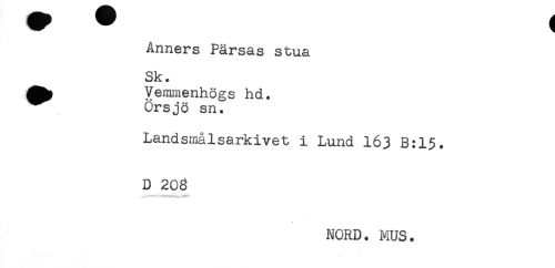 //// Anners Pärsas stua //// Sk. //// ^^ Vemmenhögs hd. //// Örsjö sn. //// Landsmålsarkivet i Lund 163 B:15. //// D 20g //// NORD. MUS. ////
