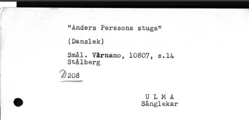 //// > . . ' * ' *. . . ' . //// f //// t .... . ... .. ' //// "Anders Perssons stuga" //// i* - - //// (Danslek) //// Smal. Värnamo, 10307, s.14 //// Stålberg //// i //// ^ U L M A //// Sånglekar ////