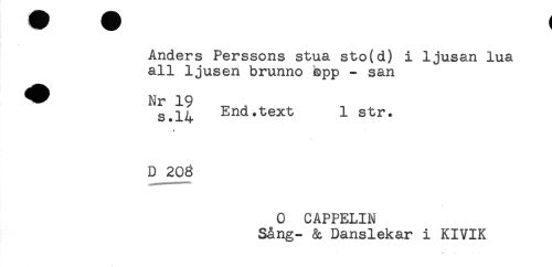 //// Anders Perssons stua sto(d) i ljusan lua //// all ljusen brunno bpp - san //// ^^ Nr 19 //// s.14 End.text 1 str* //// 0 CAPPELIN //// Sång- & Danslekar i KIVIK ////