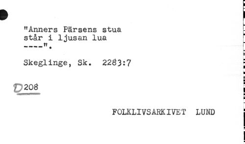 //// "Armers Pärsens stua - //// står i ljusan lua //// - —-H. //// Skeglinge, Sk. 2233:7 S //// s //// t?203 i //// FOLKLIVSARKIVET LUND j //// H //// i //// H ////