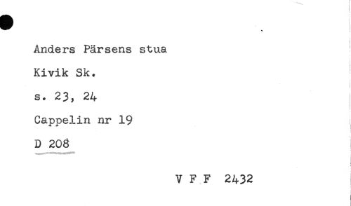 //// Anders Pärsens stua //// Kivik Sk. //// t //// s. 23, 24 //// < //// Cappelin nr 19 //// D 206 //// < //// V F F 2432 ////