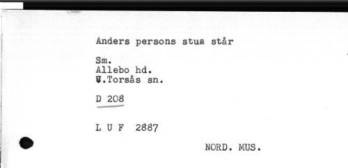 //// ' //// i //// i //// t //// Anders persons stua står //// Sm. //// Allebo hd. //// P.Torsås sn. //// D 208 //// L U F 2887 //// ^ NORD. MUS. ////