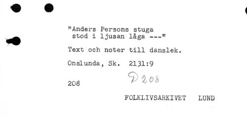 //// "Anders Persons stuga //// ^^ stod i ljusan låga---" //// Text och noter till danslek. //// Onslunda, Sk. 2131:9 //// 208 -ae - //// FOLKLIVSARKIVET LUND //// t ////