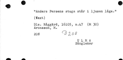 //// "Anders Persens stuga står i ljusan låga." //// (gext) //// Dis. Råggärd, 16105, s.47 (M 30) //// Aronsson, M. //// 208 //// U L M A //// Sånglekar ////
