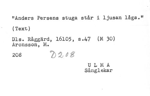 //// "Anders Persens stuga står i ljusan låga." //// (Text) //// Dis. Råggärd, 16105, s.47 (M 30) //// Aronsson, M. //// 206 //// U L M A //// Sånglekar ////