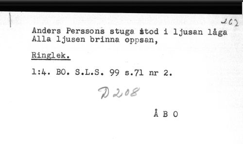 //// ! ^ //// Anders Perssons stuga stod i ljusan låga //// Alla ljusen brinna oppsan, //// Ringlek. //// 1:4. BO. S.L.S. 99 s.71 nr 2. ////