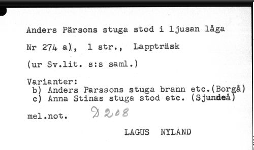 //// Anders Pärsons stuga stod i ljusan låga //// Nr 274 a), 1 str., Lappträsk //// (ur Sv.lit. s:s saml.) //// Varianter: //// b) Anders Parssons stuga brann etc.(Borgå) //// c) Anna Stinas stuga stod etc. (Sjundeå) //// mel.not. ^ //// LAGUS NYLAND //// < ////